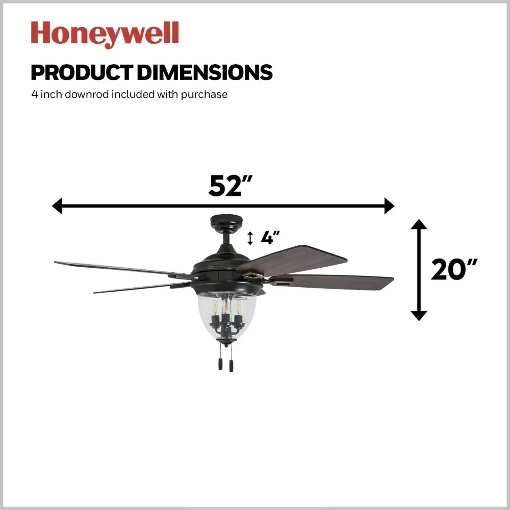 This is captivating that really brings the craftsman touch in every detail. The lighting is designed with a beautiful internal lantern surrounded by remarkably crafted clear seeded glass. The oil-rubbed bronze finish is highly complimented by the rough pine blades giving this fan a very rich and wholesome allure. The Glen crest is sure to illuminate your indoor or outdoor area leaving you in awe. The download is 4 inches in length and 0. 75 inches in width with an accompanying 54 lead wire should you wish to get a longer down rod. The Glen crest is easy to install and comes with 3 different mounting options close, standard down rod (as pictured), or angled. The motor housing is also reversible, enabling the Glen crest to not only cool during the summer but help keep your rooms warm during the winter. This fan' s size makes it the perfect match for any large to medium size room. Offering a timeless look, adequate airflow, and superior quality, just like all else Honeywell, you be able to rely on this fan for years to come.