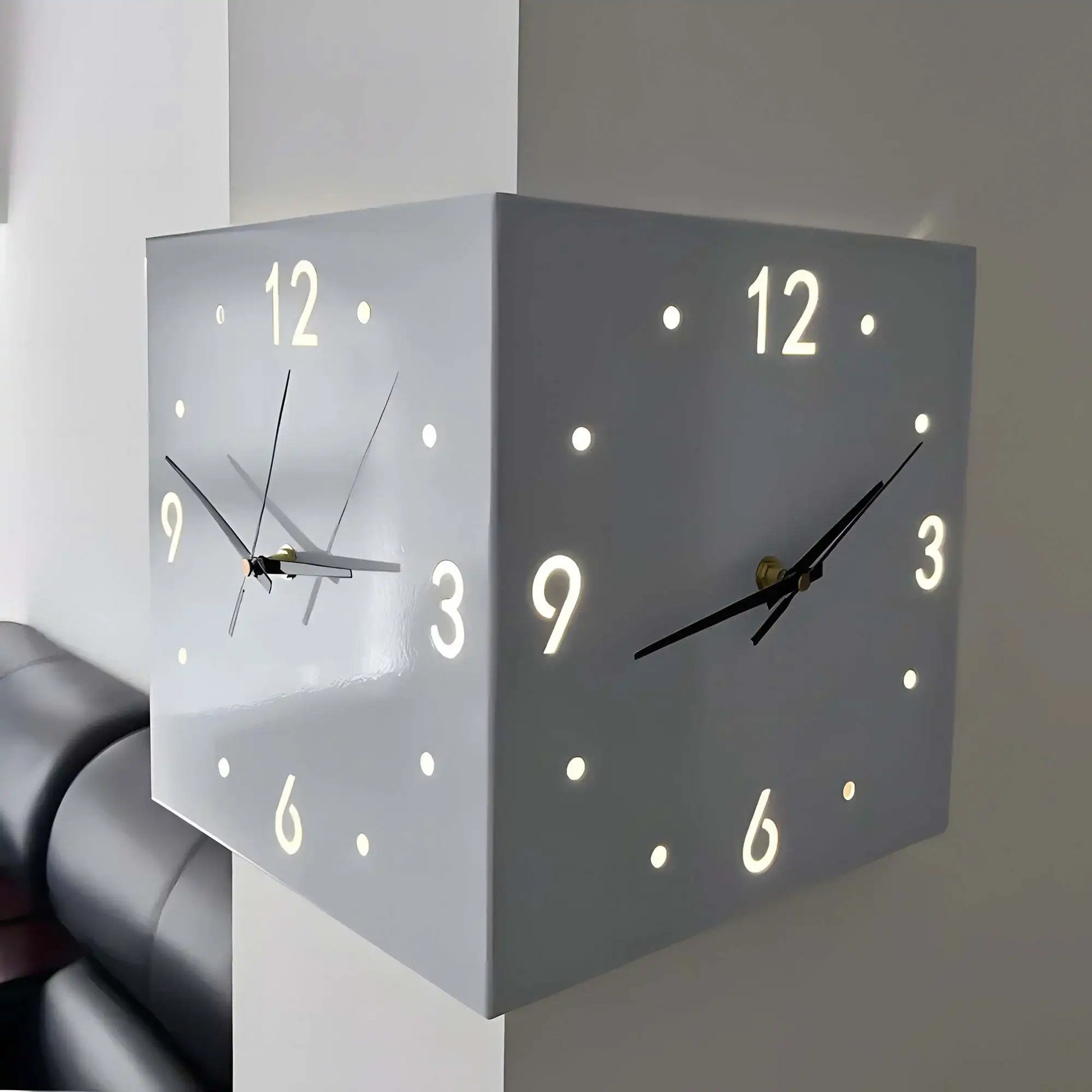 Upgrade your living room with a corner-friendly, double-sided luminous wall clock that keeps time clearly from any angle while adding a touch of sleek, modern style.