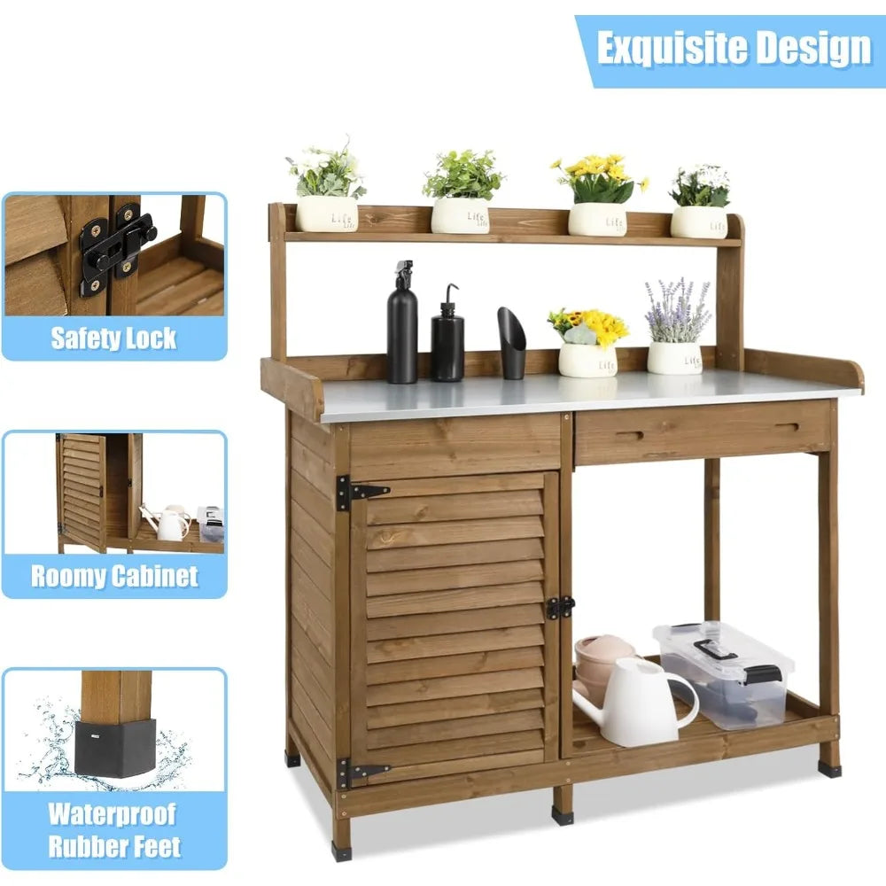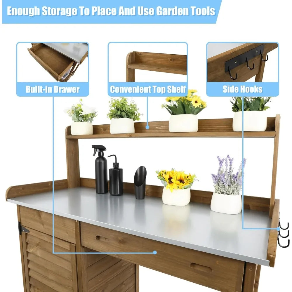 - 【Thoughtful Details】 top shelf of the work table can house your planted flowers and tools. The raised tabletop edges can prevent the falling of items on the top. The drawer, lower slatted shelf, storage cabinet and top shelf of the planting table make you store a variety of tools more easily. 3 side hooks are perfect for keeping your favorite trowel, trencher or other tools in arm's reach.