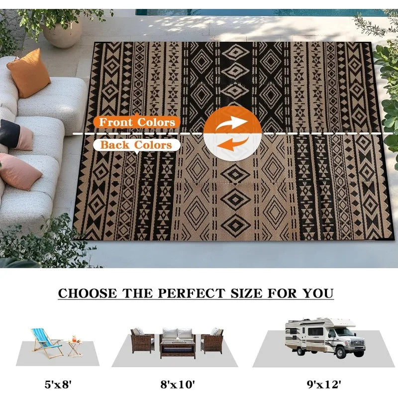 - Versatile Reversible Outdoor Rug:Our outdoor rug features a classic boho design with a reversible double-sided option, offering two different looks to complement your space. Ideal for various outdoor settings such as patios, porches, gardens, terraces, picnics, or RV camping. Available in multiple sizes and colors to suit your needs.